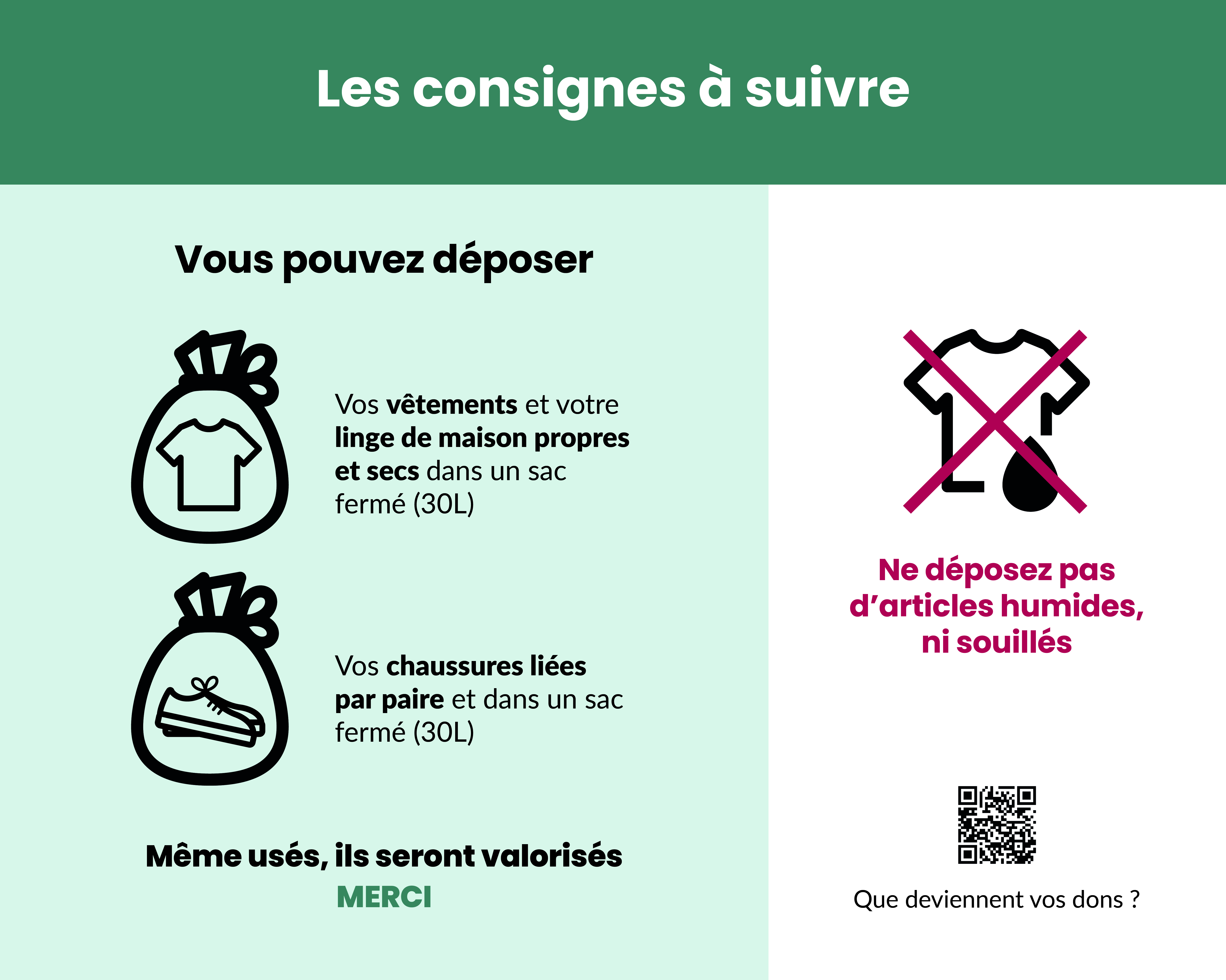 En déposant vos textiles, vous leur donnez une seconde vie, vous participez à la réduction des déchets et vous soutenez le travail solidaire*.